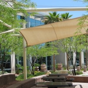 – Mái che công viên Có độ bền cao : Các loại bạt làm cấu trúc màng căng phổ biến là các loại vải bạt PVC, PTFE, HDPE…Các loại bạt này có sức căng rất tốt, lực kéo đứt lớn , có thể chịu được sức gió lên đến 120km/h .